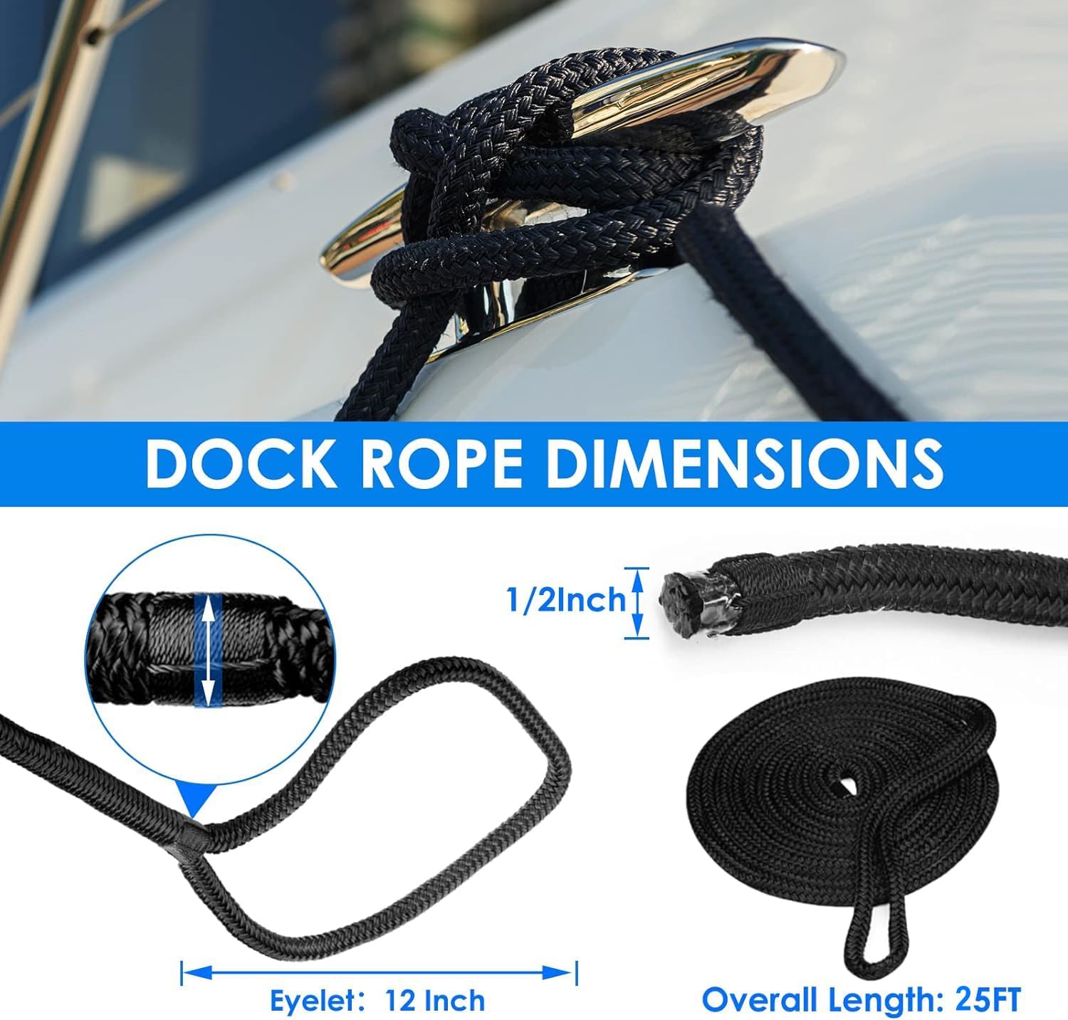 Amarine Made 1/2″ x 25′ Dock Lines, 4 Pack Boat Dock Lines for Boat, Double Braided Boat Lines with Loop Docking, Black Dock Line with 12″ Eyelet