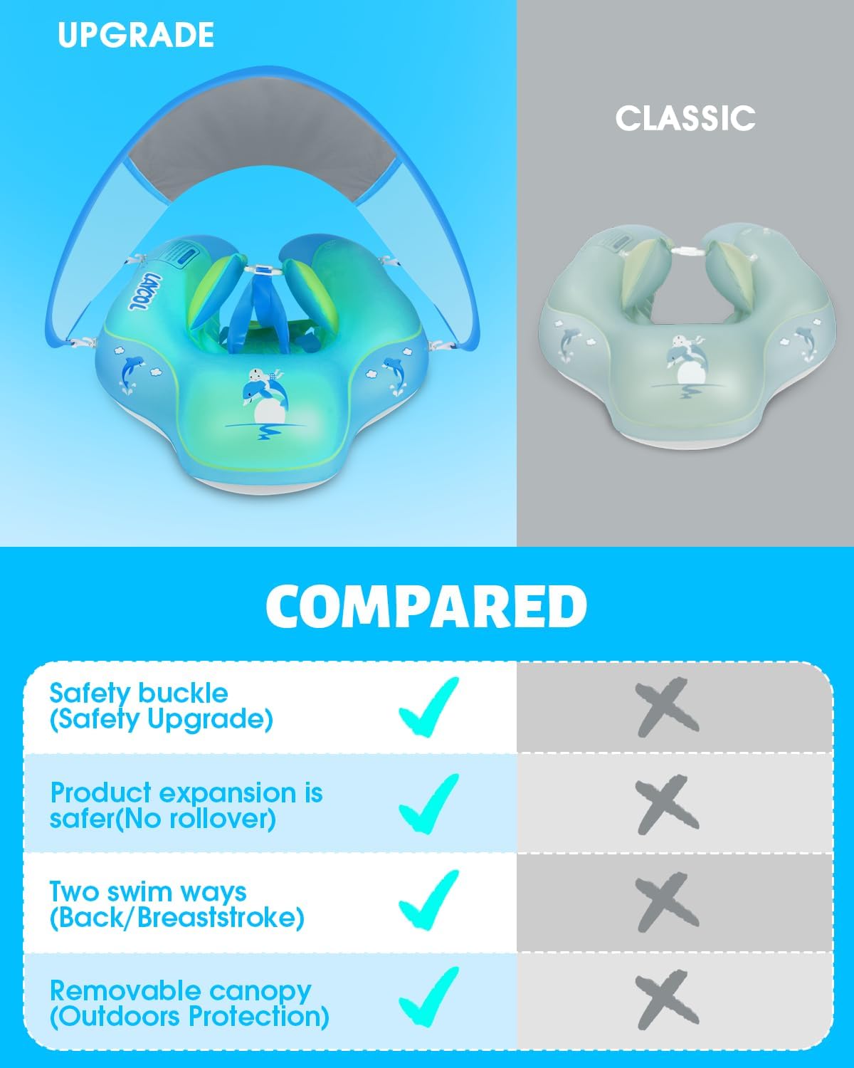 Baby Pool Float No Flip Over, Inflatable Baby Float with Sun Protection Canopy, Baby Swimming Float, Baby Swim Float with Double Air Chambers, Add Tail for Age of 3-36 Months