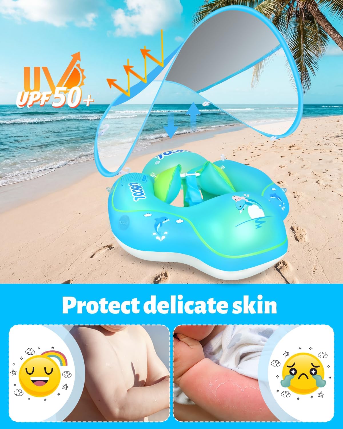 The Baby Pool Float is designed for infants aged 3 to 36 months, providing a safe and enjoyable swimming experience. This inflatable float features a sun protection canopy, ensuring your little one is shielded from harmful UV rays while they play in the water. The double air chambers enhance safety and stability, preventing the float from flipping over. Additionally, the float includes a tail for added support and comfort.