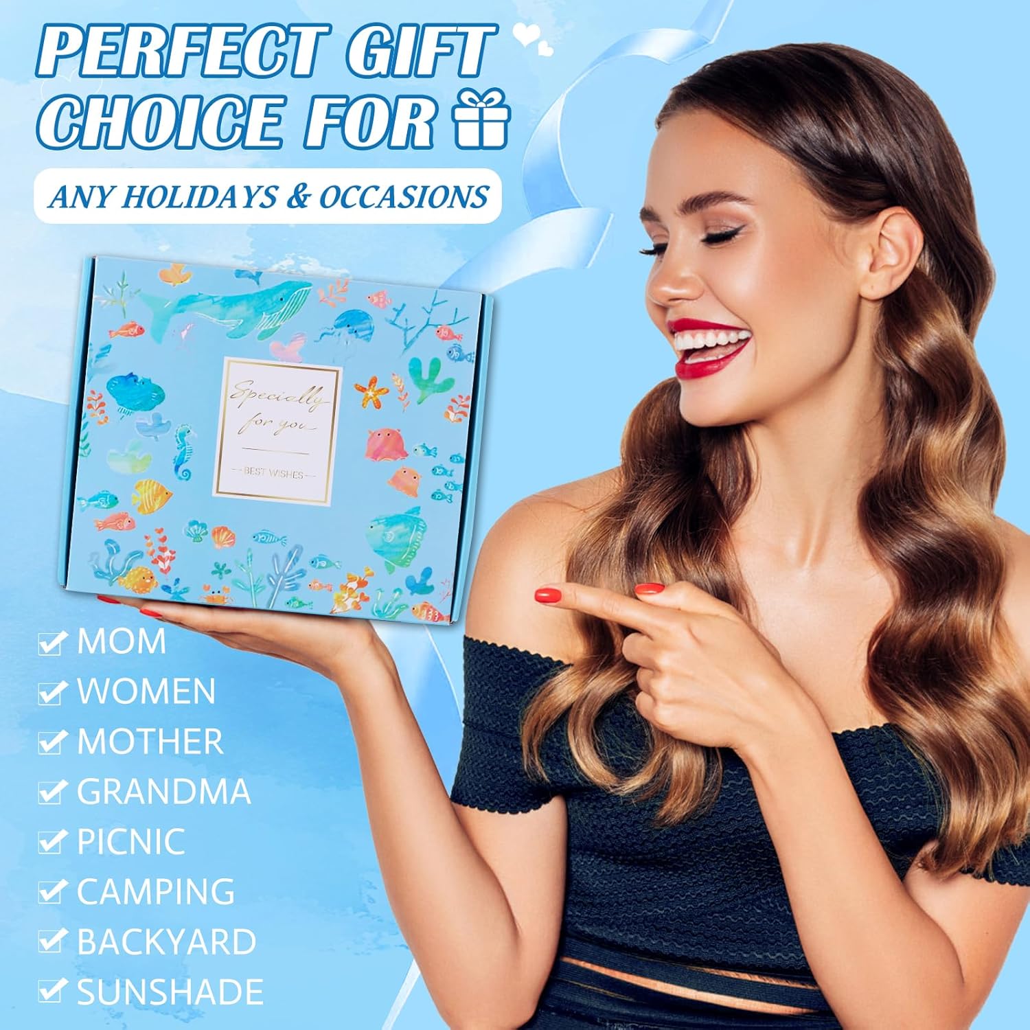 The Beferr Mothers Day Beach Gifts Basket is a thoughtfully curated bundle designed for beach lovers. This gift set includes a large 79" x 83" beach blanket that is both waterproof and sandproof, making it ideal for any beach outing. The lightweight design allows for easy transport, perfect for family gatherings or outings with friends.