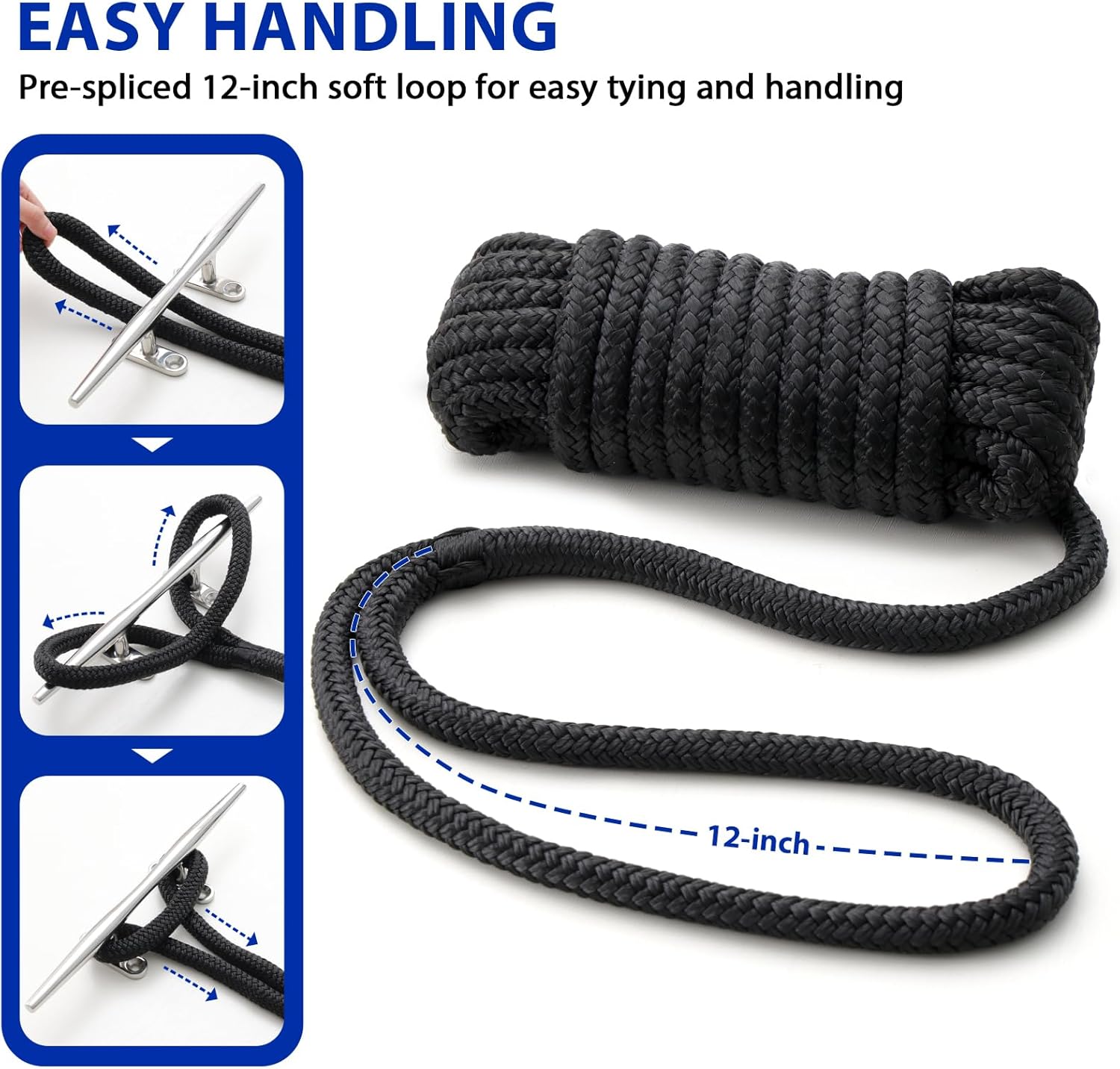 Boat Dock Lines Marine Rope – 3/8″ x 15ft with Pre-Spliced 12″ Loop Double Braided Nylon Ropes Bumper Tie Mooring Line for Boats Docking Pontoon Boating Accessories – 4 Pack