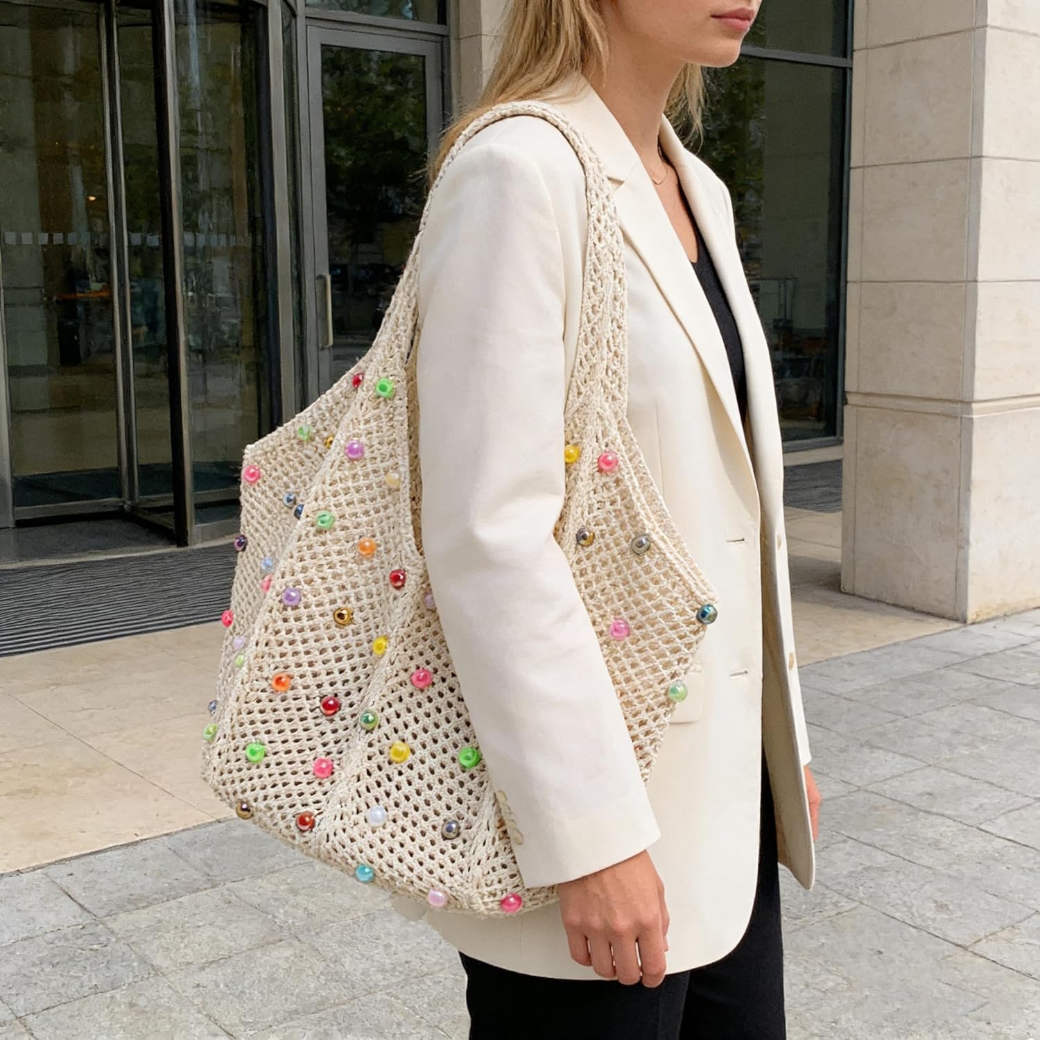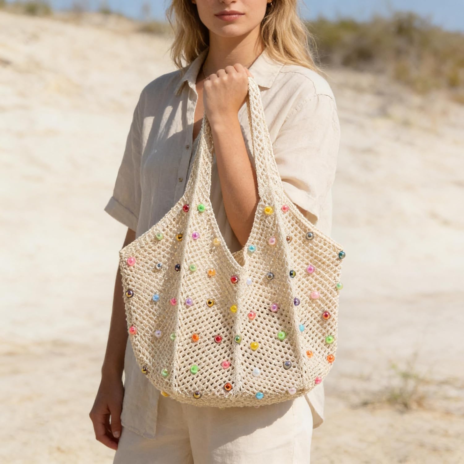 Boho Crochet Beach Tote Shoulder Bag with Colored Beads | Colorful Aesthetic Hippie Knit Bag for Women