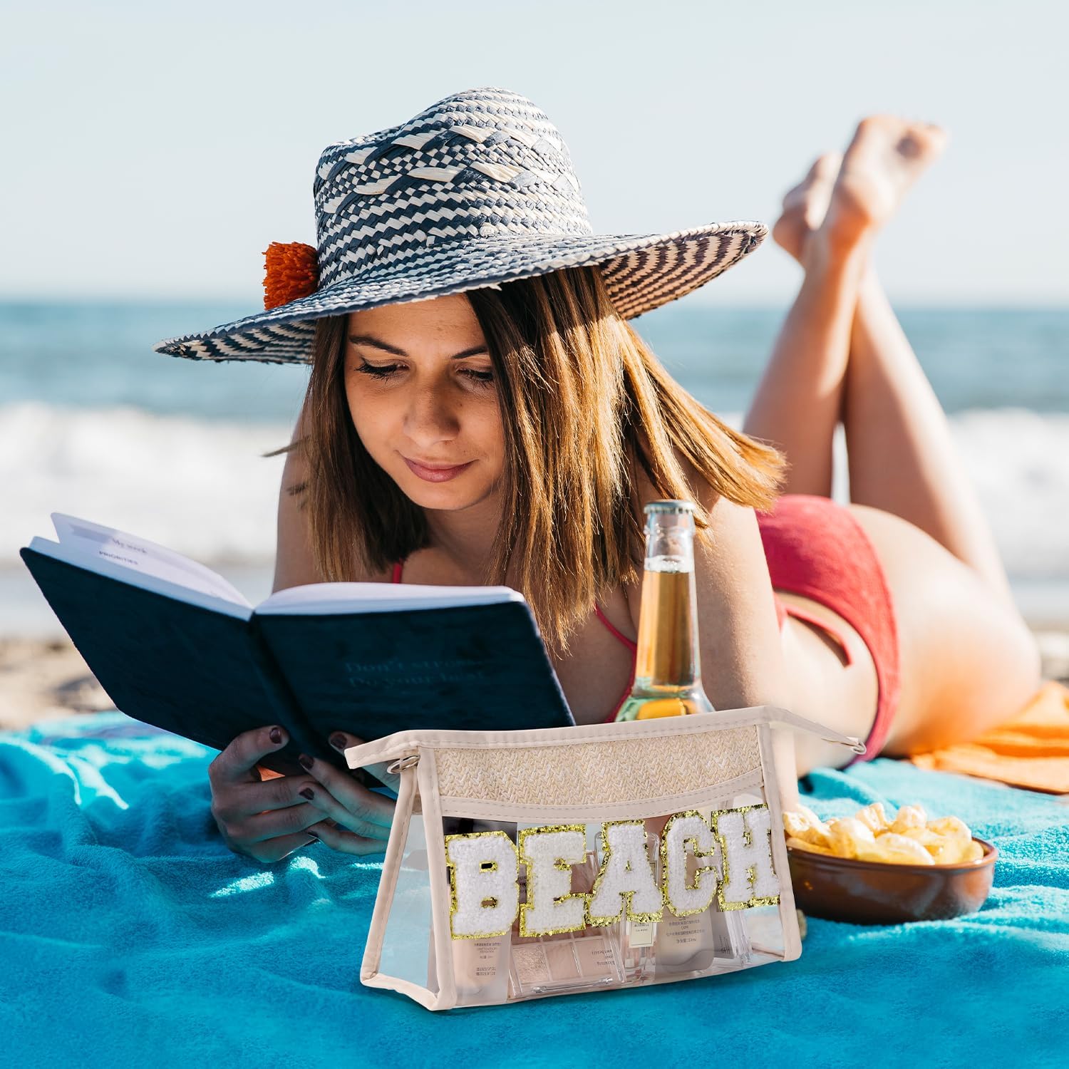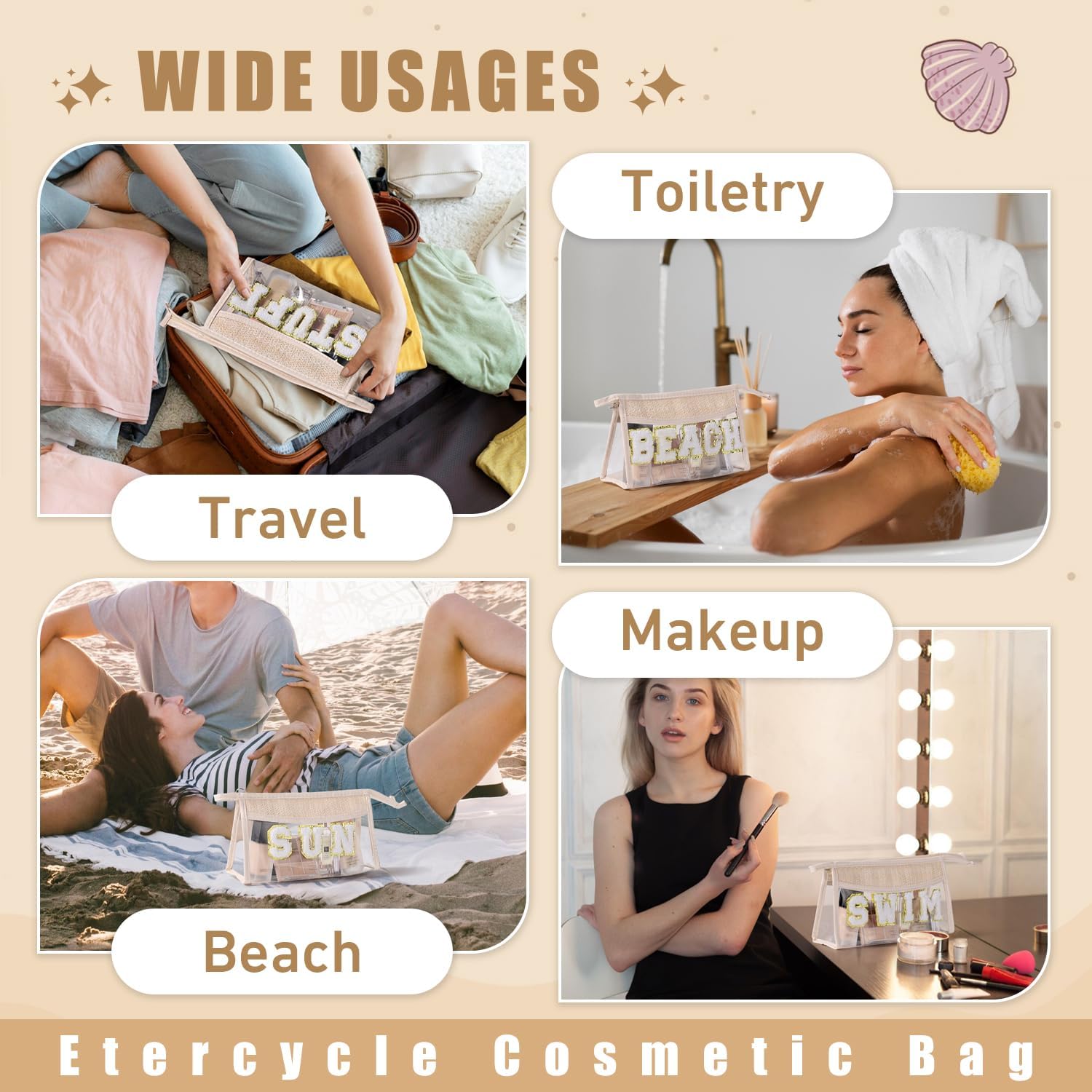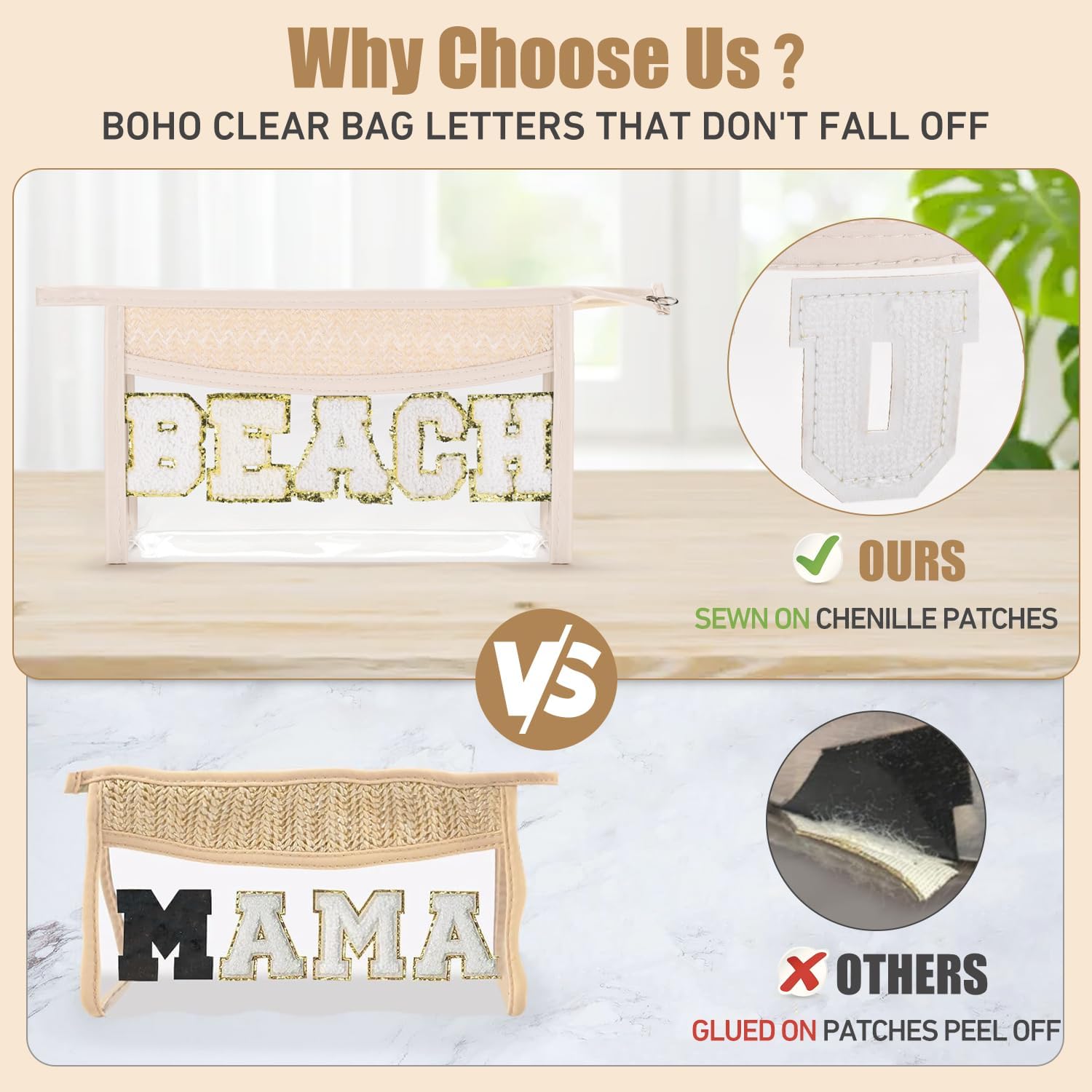 Etercycle Boho Patch BEACH Makeup Bag, Clear PVC Travel Toiletry Bag Waterproof Beach Bags for Women, Small Chenille Letter Bag With Zipper for Beach Travel Essentials