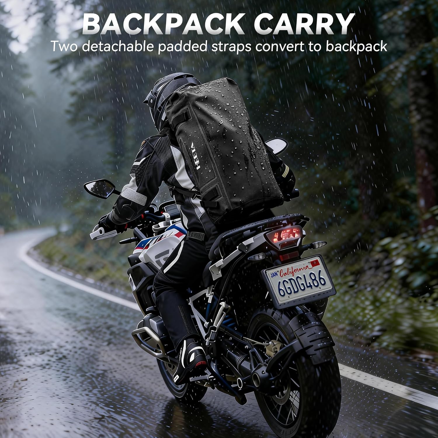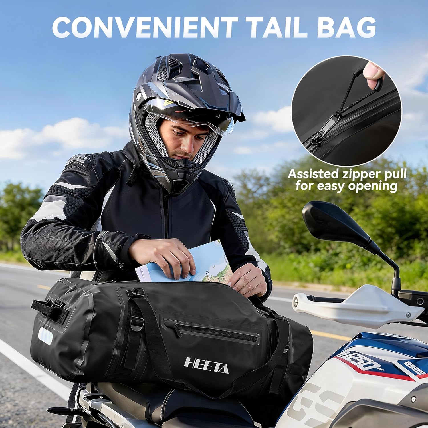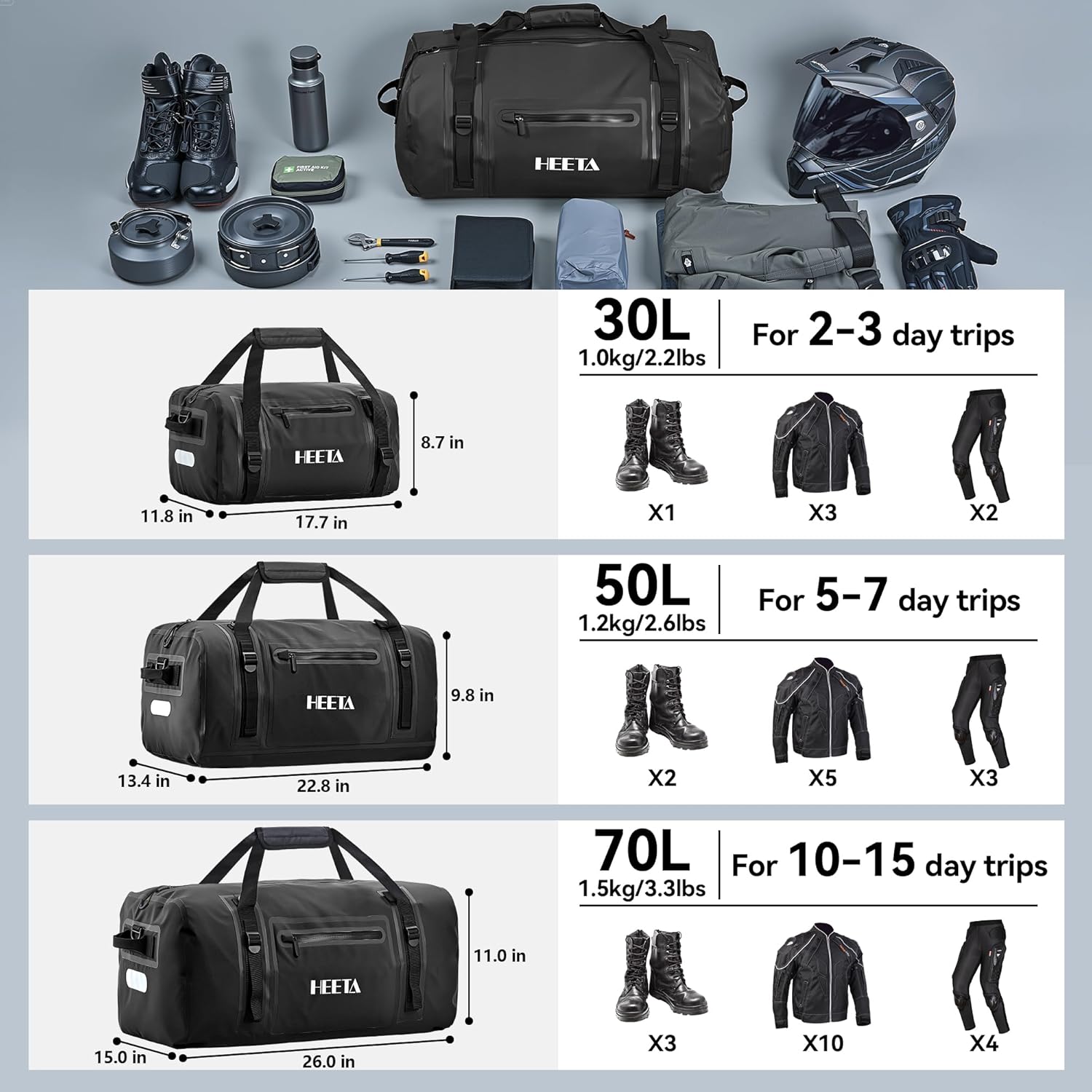 HEETA Waterproof Motorcycle Dry Bag, Waterproof Duffel Luggage Travel Bags with Zippered Closure & Pocket, Shoulder Straps, Large Space for Motorcycling Camping Commuting Boating (Black, 50L)