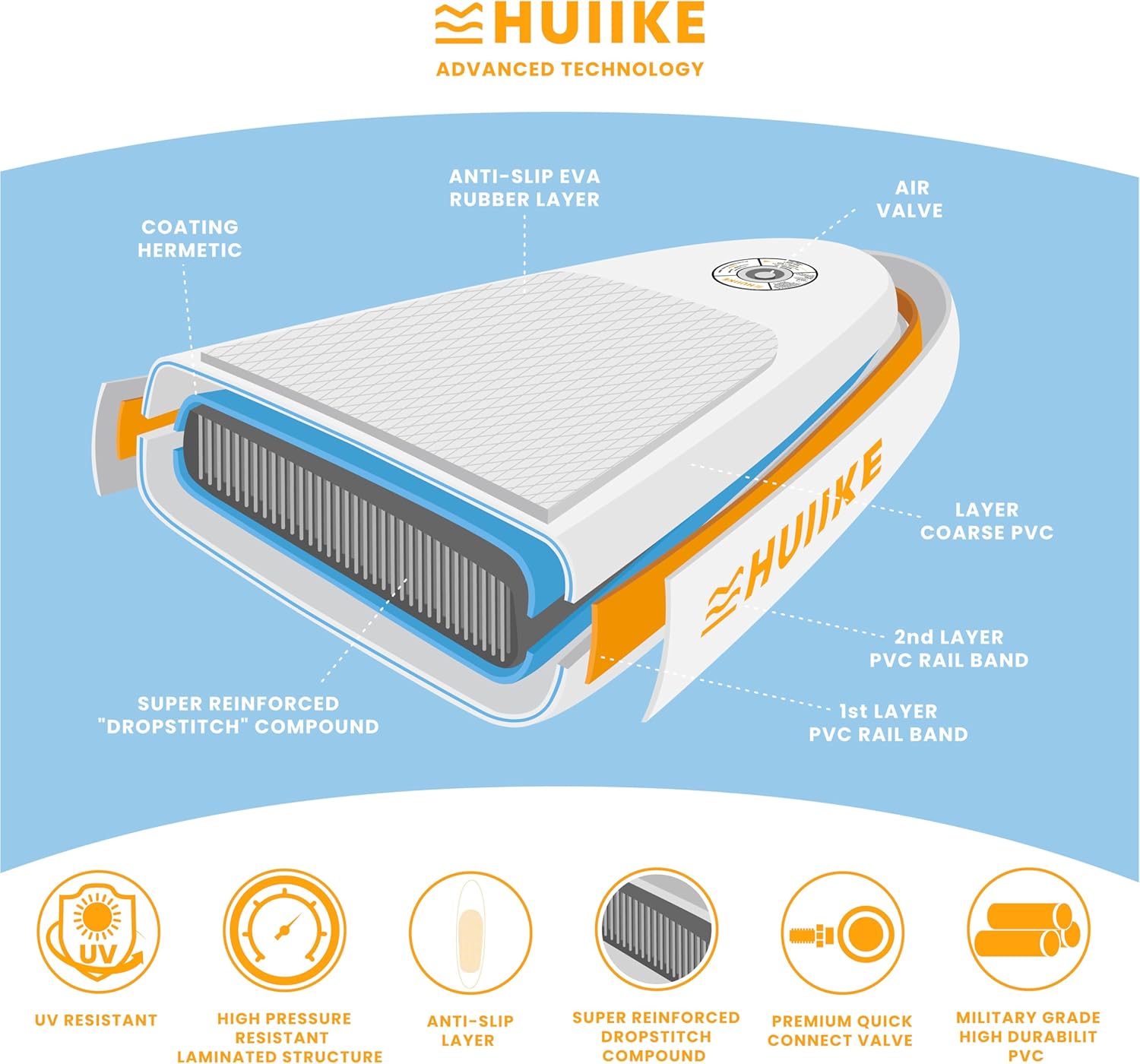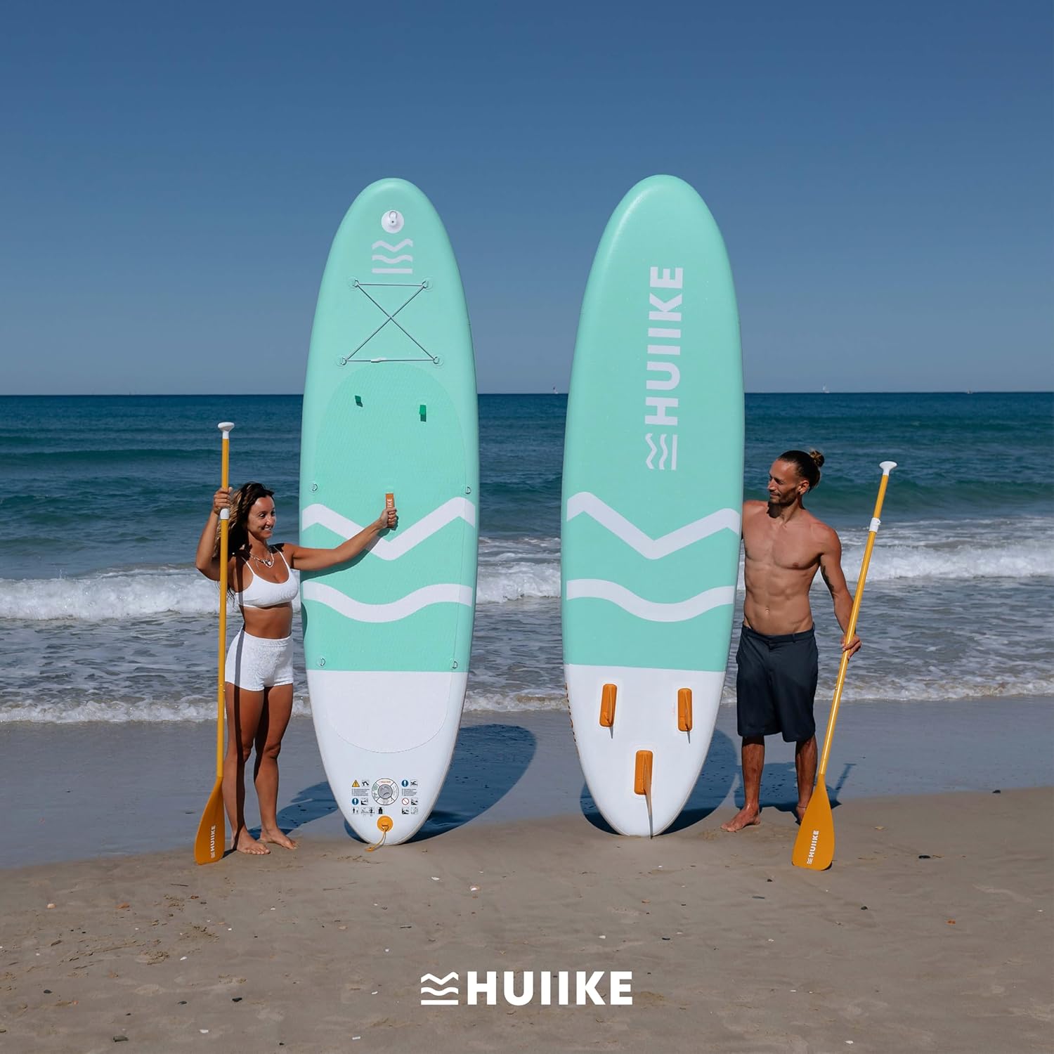 The HUIIKE Inflatable Paddle Board is designed for both paddleboarding and kayaking, making it a versatile choice for water enthusiasts. Measuring 10 feet long and 33 inches wide, it offers excellent stability, thanks to its EVA rubber layer that helps reduce the risk of falling. The board is made from military-grade PVC, ensuring durability and resistance against air leaks. Included in the package are all the necessary accessories: a dual-use aluminum paddle, three fins, a kayak seat, a pump, and more, making it a complete set for your aquatic adventures.