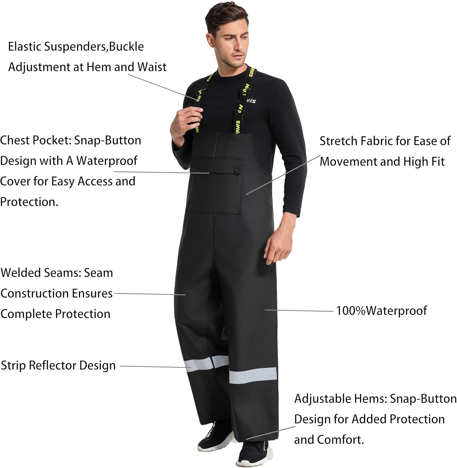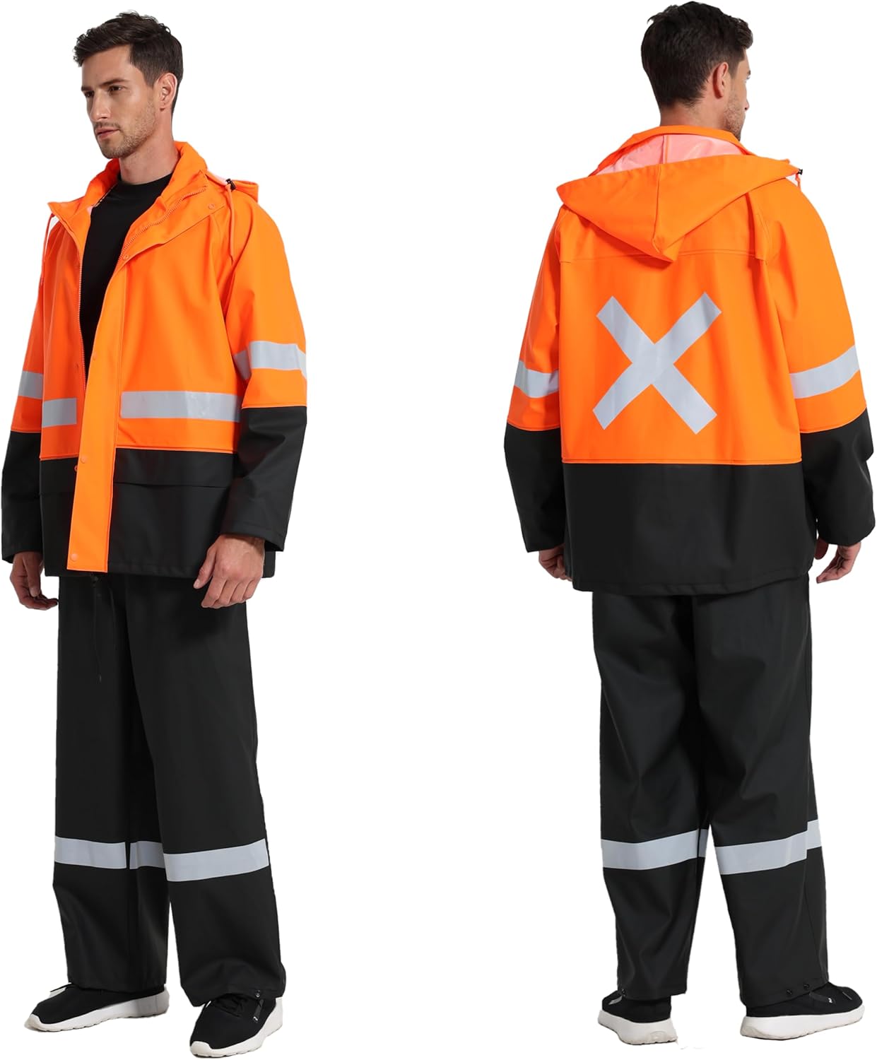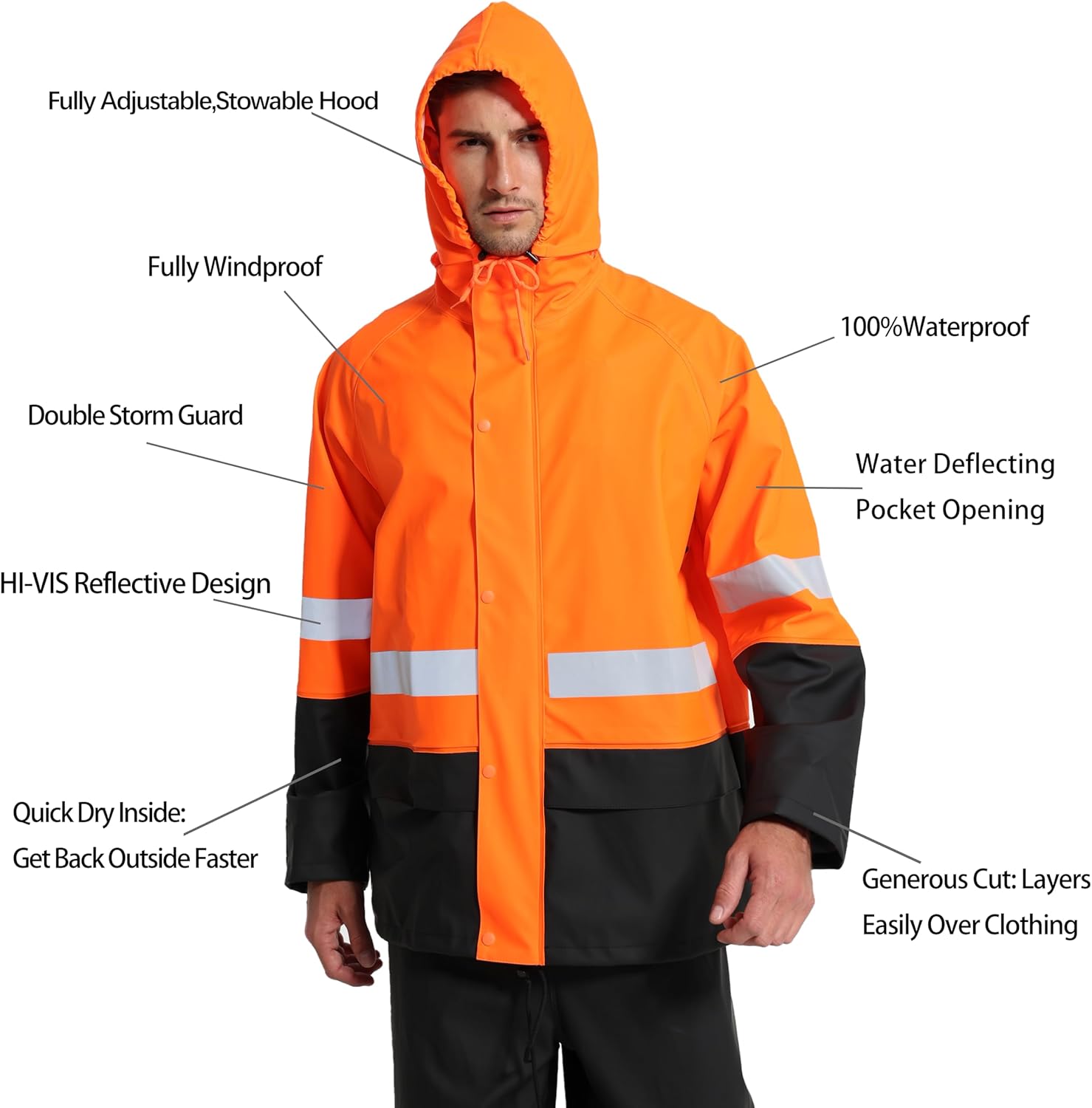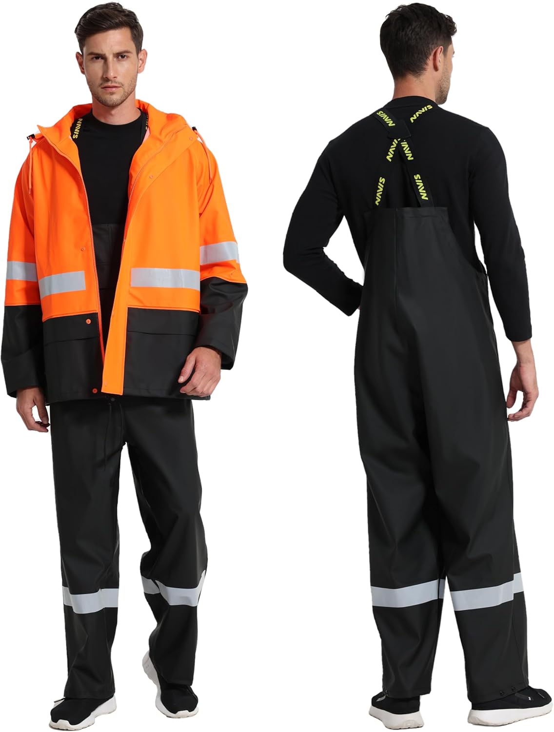 Men’s Hi-Vis Reflective Pro Workwear 3-Piece Heavy Duty Waterproof PU Rain Suit Hooded Jacket Bib for Construction Farming