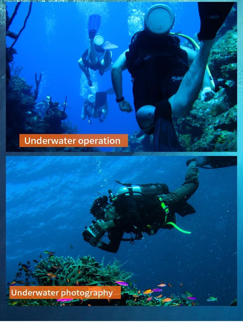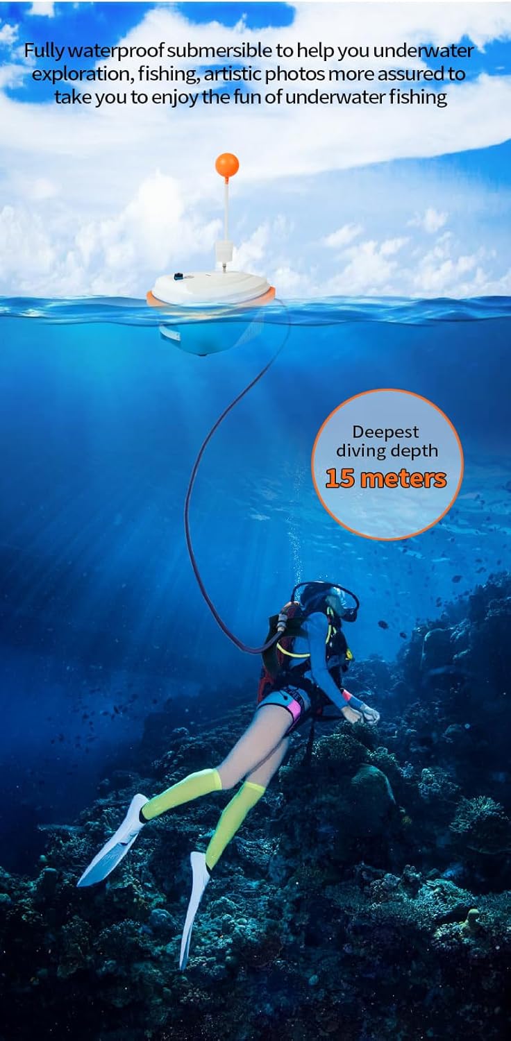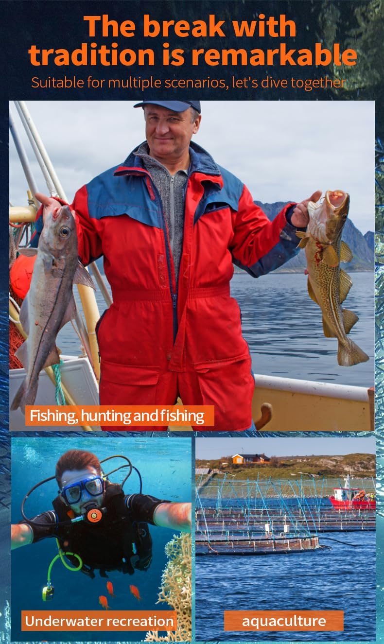 The DGLUYUDV Scuba Diving Ventilator is designed specifically for diving enthusiasts, providing a reliable source of air while underwater. This system features a rechargeable battery that lasts up to 10 hours, ensuring ample time for exploration. The ventilator compresses air from the surface, supplying fresh oxygen through a 60ft hose. It supports two divers simultaneously, with a maximum depth of 60ft for one diver and 23ft for two. The package includes essential accessories such as a diving flag, an extended intake pipe, and an activated carbon filter to ensure clean air.
