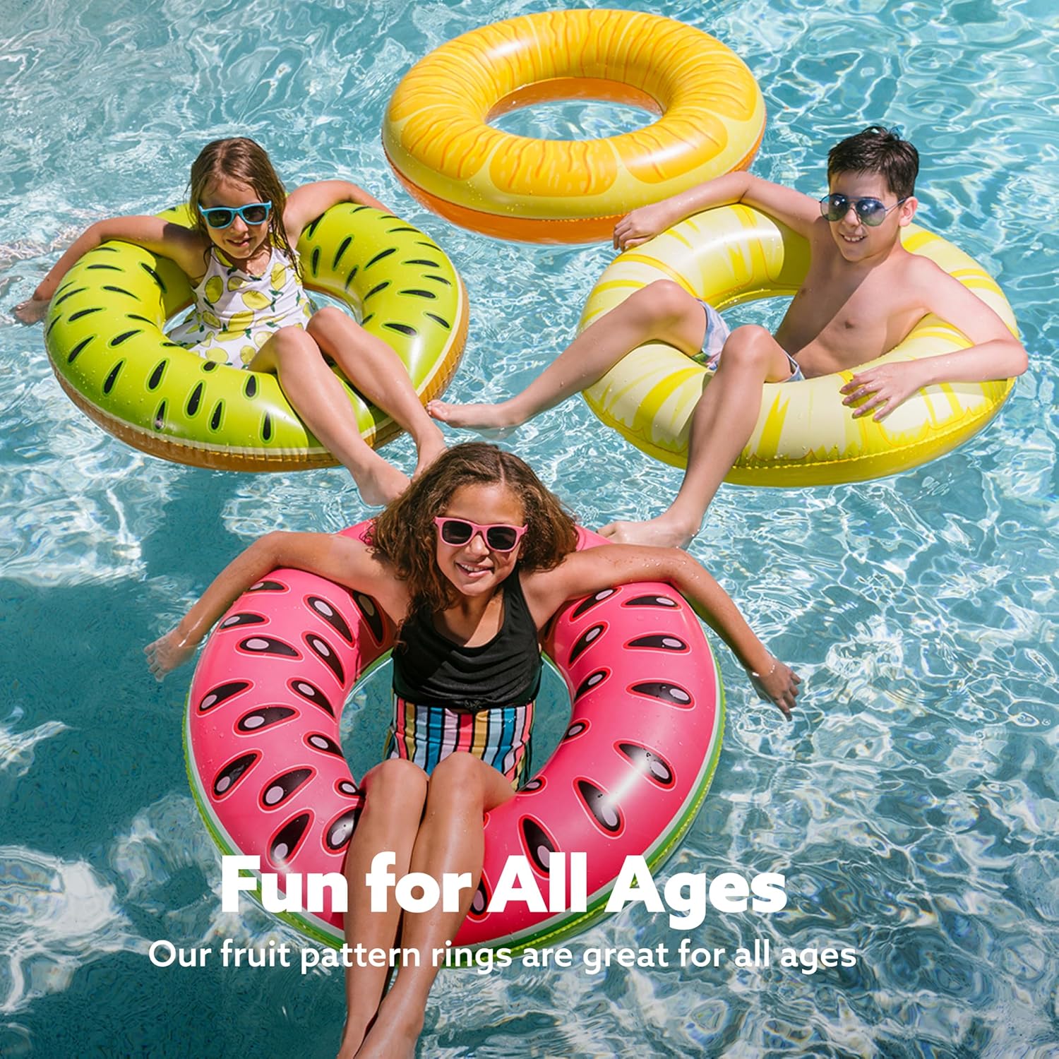 The pack includes Inflatable Fruit Pool Tubes in four designs: Watermelon, Kiwi, Pineapple, and Orange.
