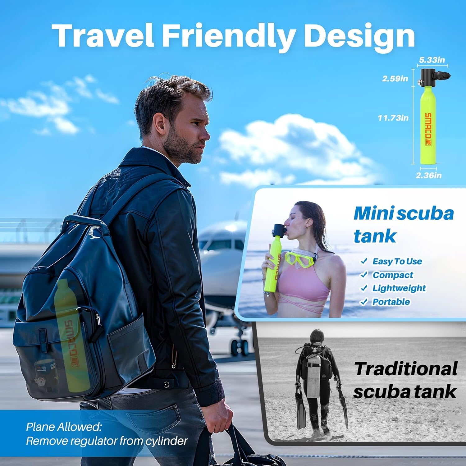 SMACO Mini Scuba Tank 0.5L Portable Small Diving Tank for Underwater Breathing Reusable Diving Cylinder Lung Air Tank for Emergency Rescue Boat Cleaning Backup Air Source Pony Bottle S300