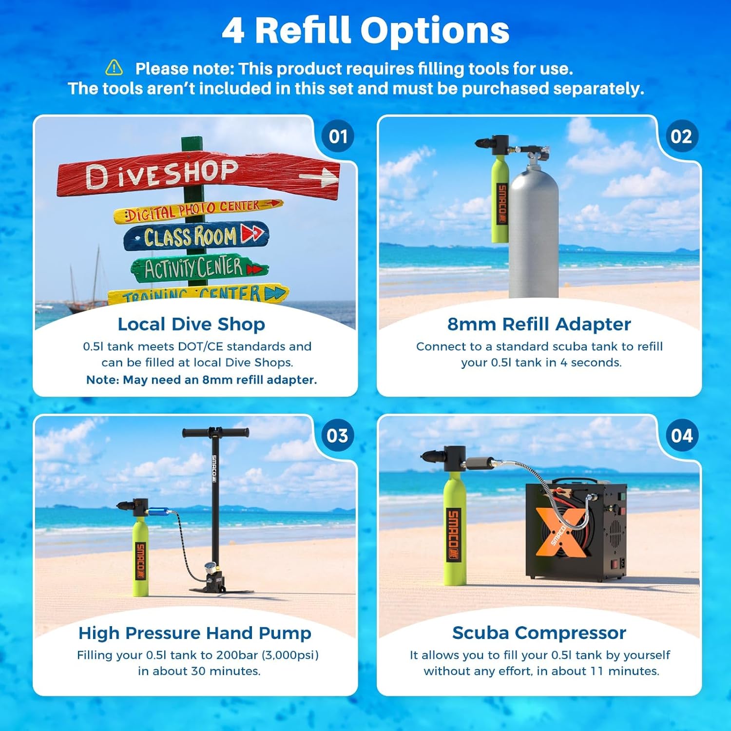 - Can be filled using multiple methods, including local dive shops