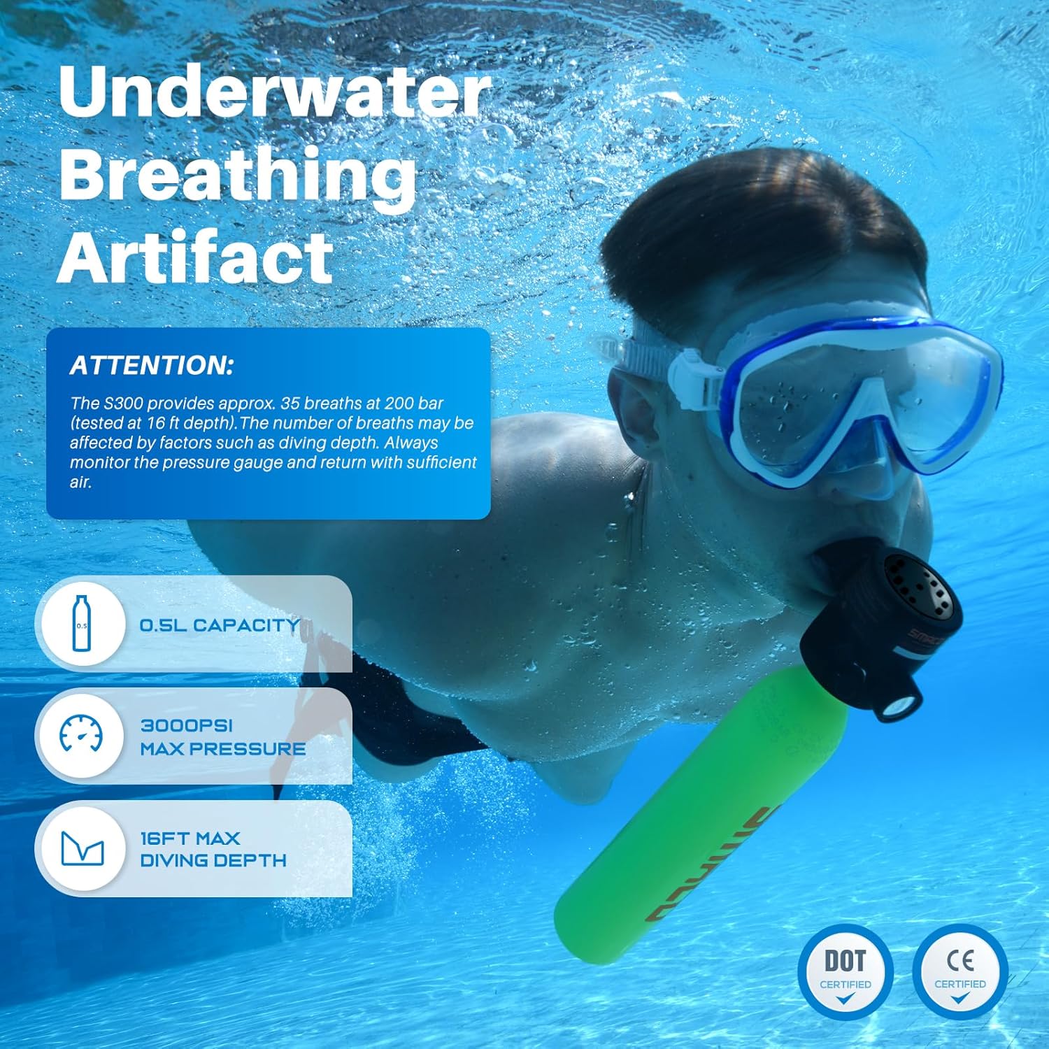 The SMACO Mini Scuba Tank 0.5L is designed for those who need a portable and reliable air source for underwater activities. This latest S300 model features an external explosion-proof device, enhancing safety during use. The upgraded breathing valve core ensures a smoother breathing experience. With a capacity of 0.5L, it can provide approximately 35 breaths at a pressure of 200 bar, tested at a depth of 16 ft.