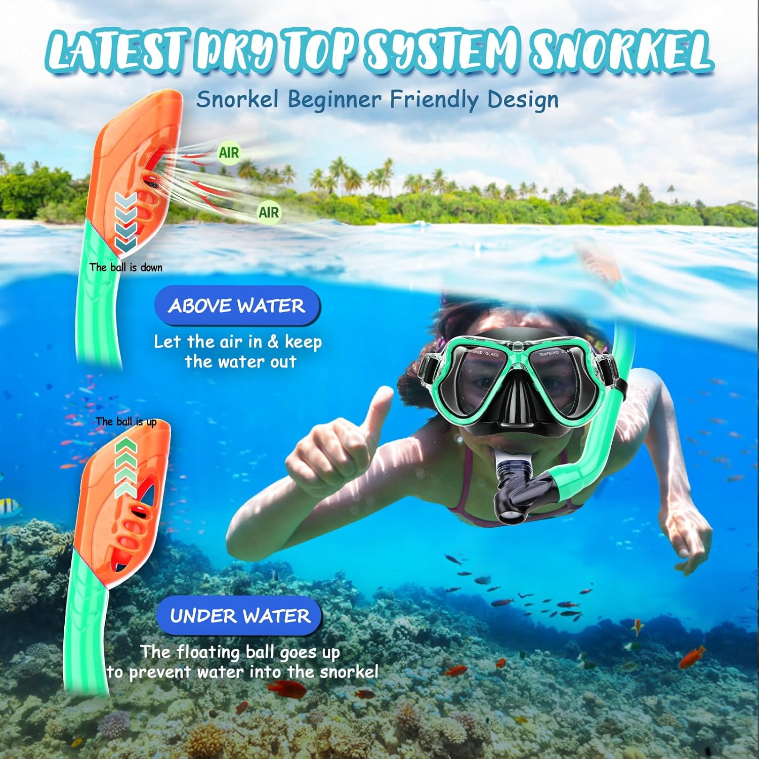- Dry top snorkel to keep water out