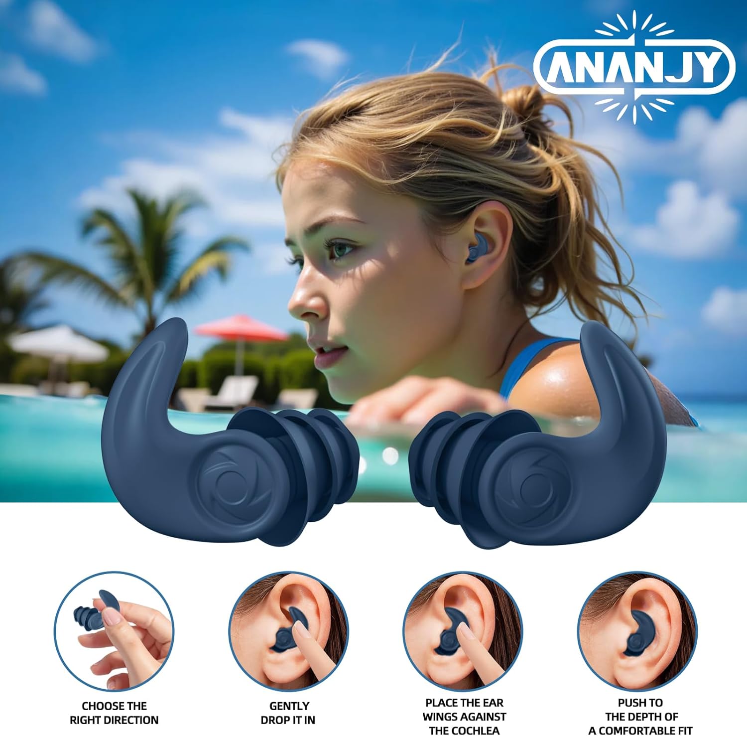 Swimming Ear Plugs for Adults – 3 Pairs Reusable Waterproof Silicone Earplugs, Soft & Comfortable Swim Ear Protection for Surfing, Diving, Pool, Showering & Water Sports