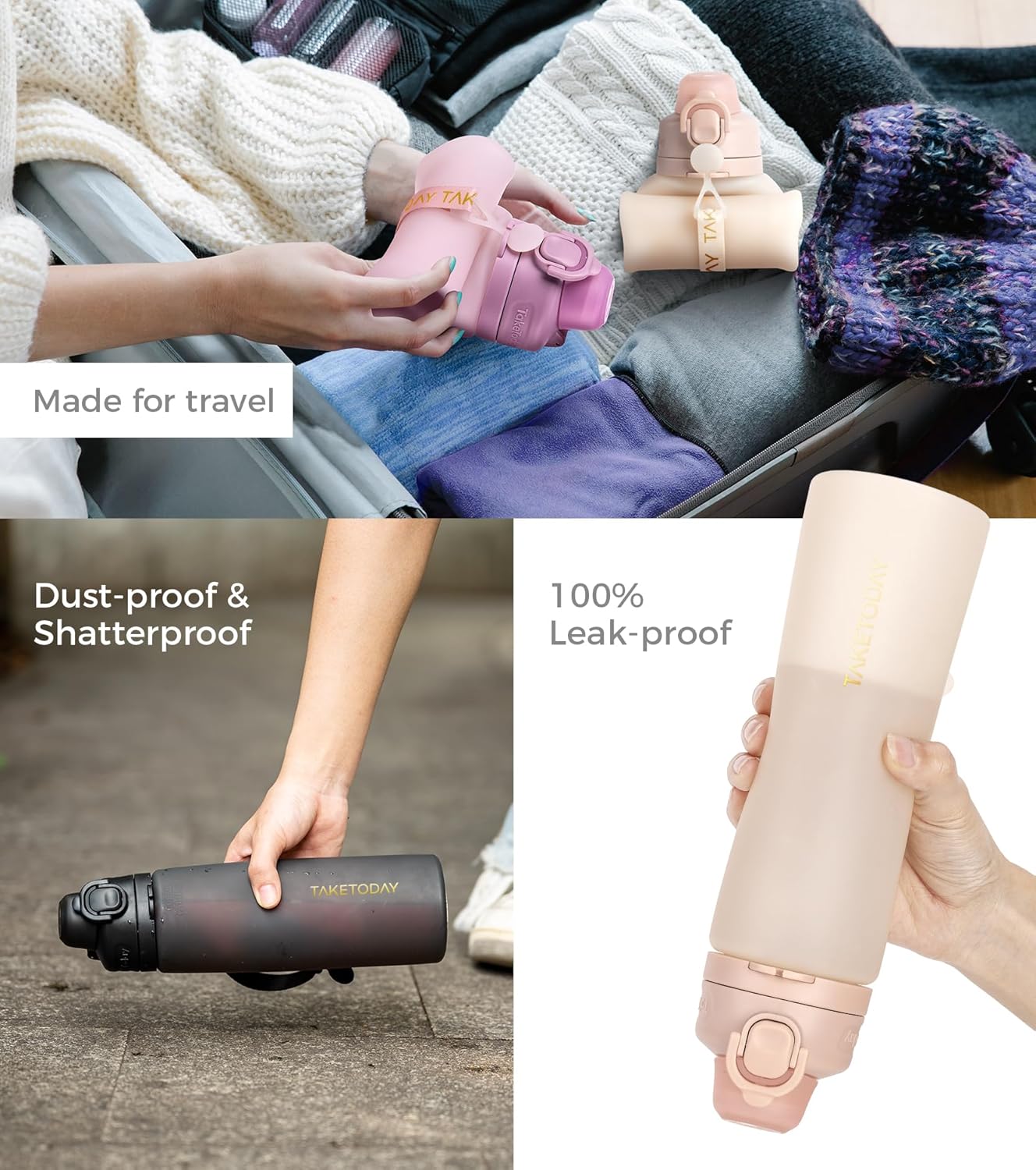 TakeToday Collapsible Water Bottles 20oz (600mL), Foldable Platinum Silicone Travel Water Bottle with Straw & Carry Strap, Leak-Resistant Screw Lid, Wide Mouth, BPA-Free for Hiking, Camping, Travel