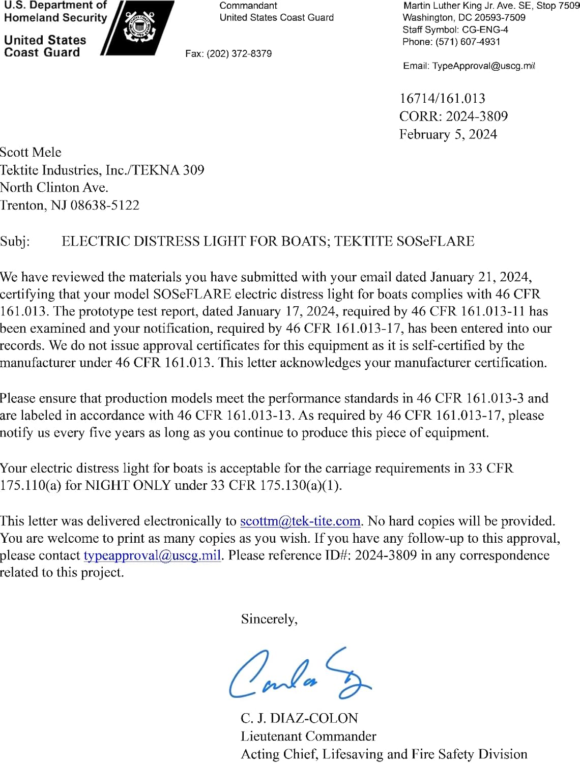 The TEKTITE® SOSeFLARE 5 is an innovative electronic boat distress flare designed to enhance marine safety. This product is USCG and SOLAS compliant, ensuring it meets rigorous safety standards. The kit includes a waterproof LED signal and an audible locator, making it a reliable choice for boaters. Its features provide an effective alternative to traditional flares, which can be hazardous and environmentally unfriendly.