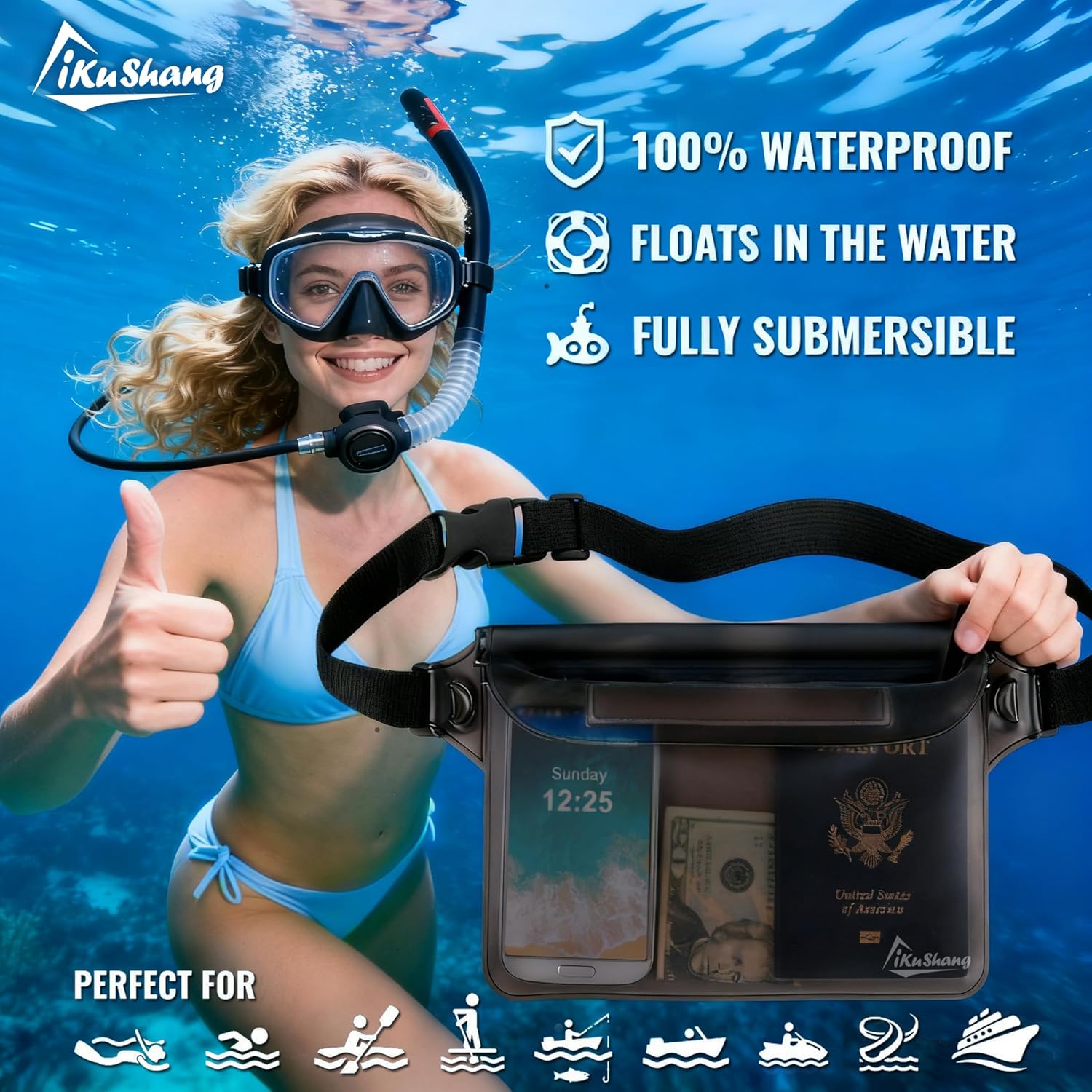 Waterproof Fanny Pack with Triple Zip Lock, Submersible Up to 32FT Dry Bag Pouch, Touchscreen Phone Case for Beach, Cruise, Swimming & Kayaking Essentials